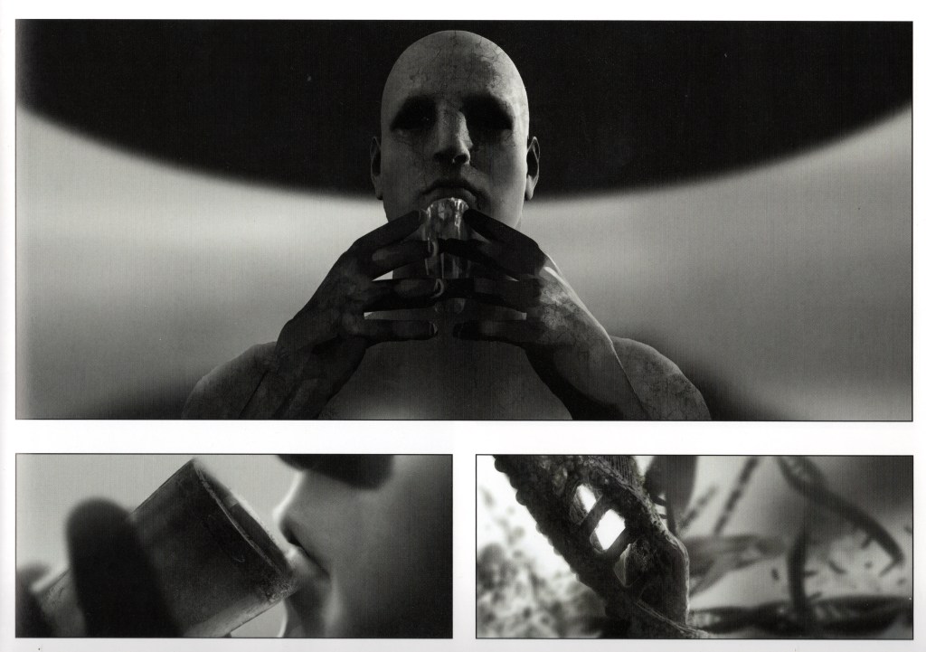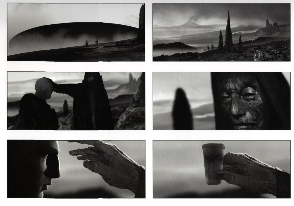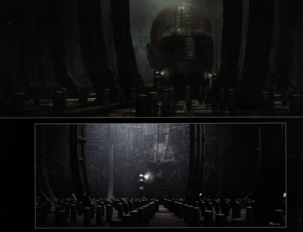 A later scene gives us clues to this dynamic behavior of the (protoconscious?) black liquid. The human explorers upon arriving on the moon LV-223 (because of the cosmological references they have found to ancient human civilizations) find a particular settlement, which is not natural. They assume it to be the ruins of an ancient civilization. On exploring it they discover a temple-like chamber where a monument in the shape of a human face rests. Around it are murals with figures of engineers, and on the floor lie hundreds of containers filled with the mysterious black liquid. There are two details that the explorers do not notice. The shots focus on some worm-like animals that begin to emerge from the floor as the black liquid begins to vibrate in some of the containers. One of the explorers senses that something is going on around them and verbally indicates that they are altering the atmosphere of the place.